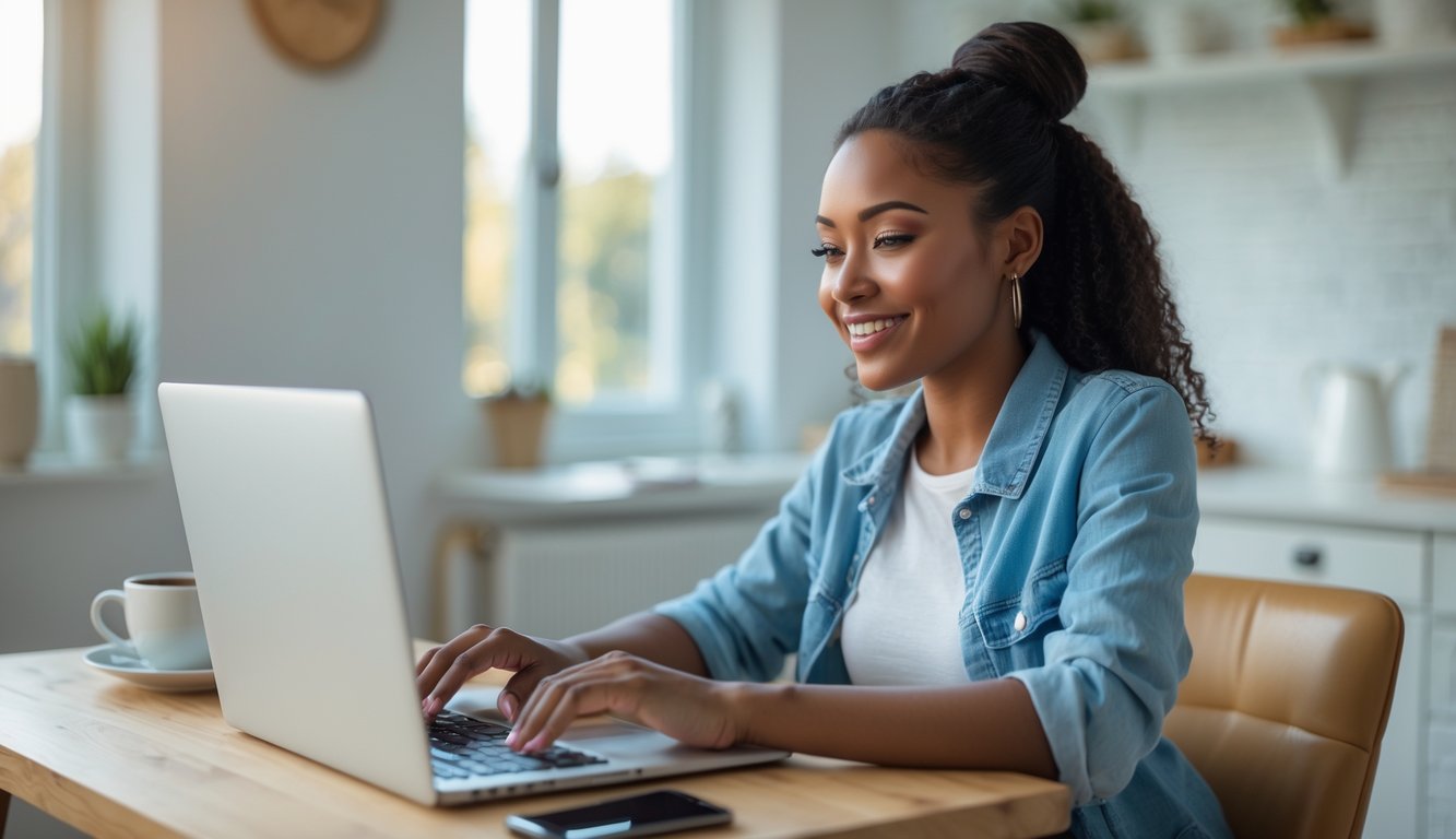 Seorang wanita muda sedang menggunakan laptop di ruang kerja rumah yang nyaman dengan senyum di wajahnya.